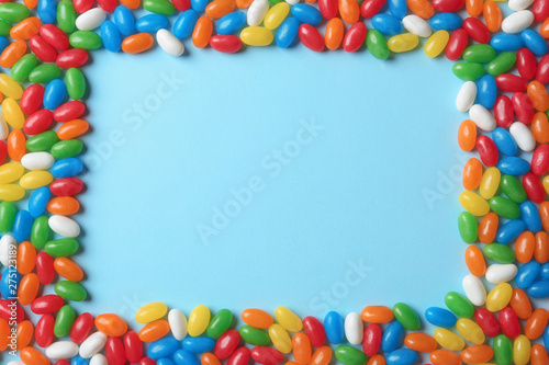 Flat lay composition with delicious jelly beans on color background. Space for text