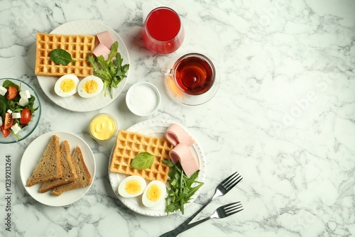 arugula, background, belgian, boiled, bread, breakfast, brunch, composition, cooked, copy, delicious, diet, dinner, dish, drink, eat, egg, flat, food, fresh, epicure, ham, healthy, homemade, lay, lifestyle, lunch, marble, meal, menu, morning, natural, nourishment, object, organic, plate, product, salad, served, snack, space, table, tasty, tea, text, top, view, waffle, white