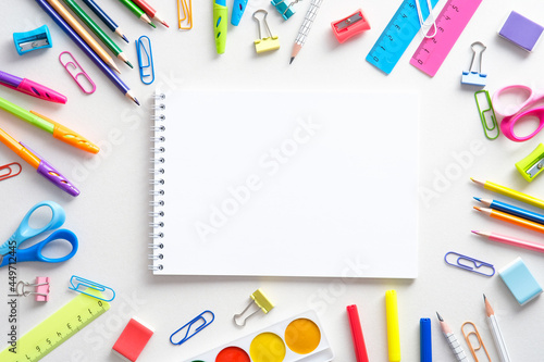 Flat lay frame of school supplies and blank paper notepad on white background. Back to school concept. Top view, overhead, space for text