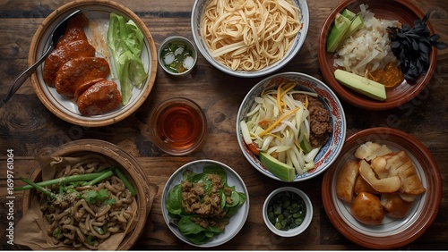 food, asian, wooden table, vibrant, colourful, fresh, topview, photo, delicious, cookery, cooking, meal, snack, traditional, culinary, epicure, tasty, authentic, eatery, dish, variety, spicey, healthy, lifestyle, dining, market, plate, appetising, cultural, exotic, trendy, clean, background, creative, digital, hi-res, culinary arts, food photography, decorative, kitchen, menu, bright