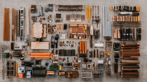 Flat lay of an assortment of scaffolding braces and structural supports on concrete.