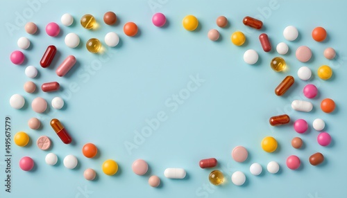 capsule, pill, medication, pharmaceutical, supplement, vitamin, health, wellness, symmetry, arrangement, organised, pastel, blue, background, minimal, clean, visual, rythm, layout, medicals, health care, prescription, dosage, assorted, colourful, pattern, holistic, ai, generative, medicine