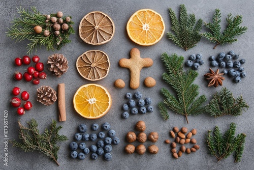 flat, lay, christmas, decoration, garland, orange, slice, gingerbread, cookie, hawthorn, berry, branch, greenery, nut, blueberry, grey, concrete, background, high, resolution, holiday, festive, winter, natural, element, organic, texture, colours, contrast, light, shadow, detail, closeup, seasonal, celebration, joy, cheer, creative, design, composition, arrangement, still, life, table, top, minimalist, modern, stylish, elegant