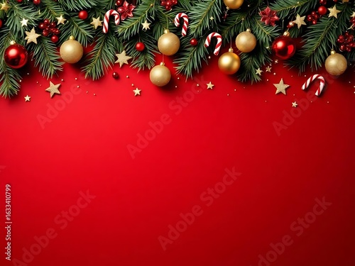 christmas, red, background, holiday, decoration, ornament, festive, new year, celebration, christmas, candy, ball, fir, gift, pine, winter, tree branch, sparkle, merry, joy, seasonal, gold, design, greeting, traditional, season, bright, event, colours, shiny, decor, december, invitation, mood, style, modern, simple, aesthetic, frame, border, template, new year, christmas tree, card, ribbon
