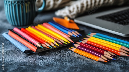 Flat lay of creative workspace sketchbooks colorful pencils a laptop and coffee cup arranged aesthetically