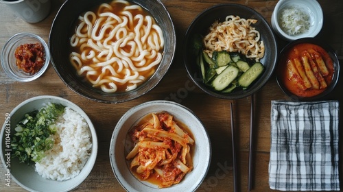 Flat lay of East Asian comfort food, udon noodles, kimchi fried rice, pickled vegetables, cozy home-style setup
