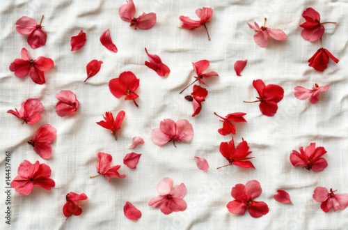 Flat lay of sakura flowers and petals on a white linen textured