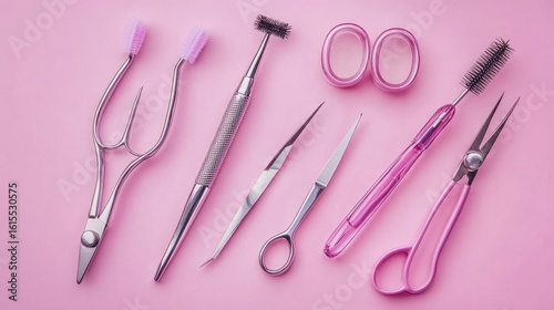 tool, manicure, nail, beauty, accessory, pink, silver, scissors, tweezer, brush, care, professional, equipment, detail, instrument, design, salon, top, view, flat, layout, image, supply, metal, plastic