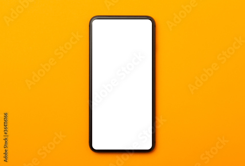 Flat lay, top view of orange office table desk with smartphone blank screen mockup with clipping path. Modern working space.