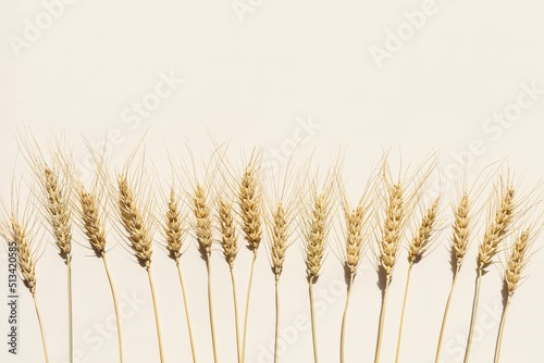 Flat lay with dry ears of wheat with awns on beige background with empty space. Top view ears of cereal crops, wheat grain crop, harvest concept, minimal design, cereals plant with hard shadow