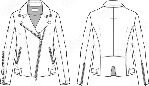 Flat sketch of women’s biker jacket with zippered pockets, long sleeves, lapel collar, technical fashion cad drawing illustration