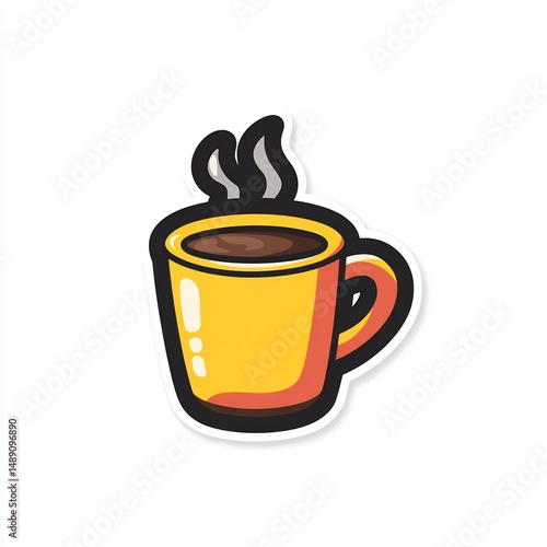 Flat steaming coffee cup, cartoon sticker style, bold outline, subject on a solid pure white background, Dark Outlined, no shadows, no texture