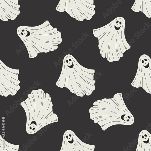 Flat style ghost seamless pattern. Scary white ghost. Happy Halloween. Cute vintage spooky character. Vector illustration for posters, decoration and print.
