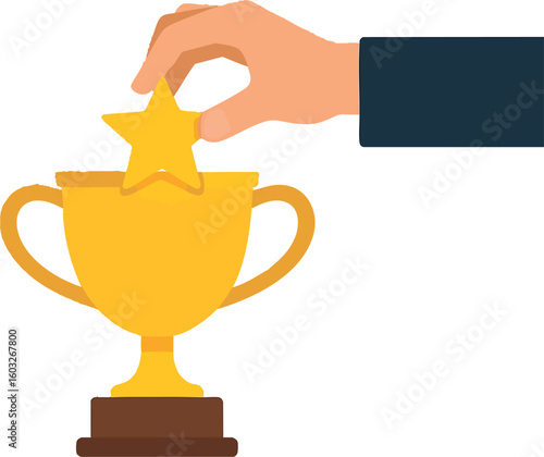 Flat vector hand placing a star on a trophy, ambition as recognition, isolated on white