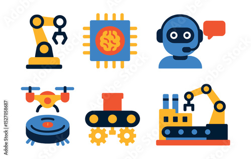 flat, vector, icon, robotic, automation, robotic, arm, chips, ai, assistant, warehouse, robot, drone, cleaning, smart, conveyer, factory