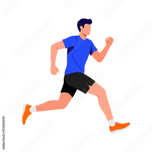Flat vector illustration of a man running in a blue shirt and black shorts with orange shoes.