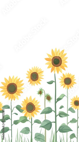 Flat vector illustration of sunflowers growing in rows, against a white background, in a simple and clean style, with bright colors