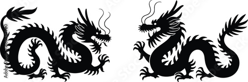 Flat vector illustration of two traditional Chinese dragon silhouettes, ideal for mythology, fantasy, culture, tattoo, Asian art, and folklore designs