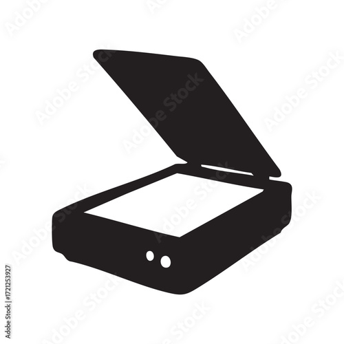 Flatbed Scanner Machine Silhouette Graphic Representation Open Lid Position for Digitizing Documents and Photographic Images Effectively in Office Automation