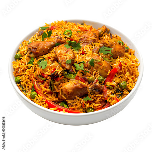 Flavorful chicken biryani served in a white bowl, garnished with fresh herbs and vibrant vegetables, showcasing a traditional and appetizing dish