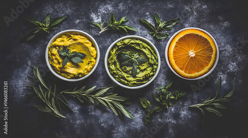 Flavorful Culinary Trio: A captivating top-down shot presents a trio of vibrantly colored dishes, each brimming with culinary delight and aromatic herbs, alongside a juicy slice of orange.