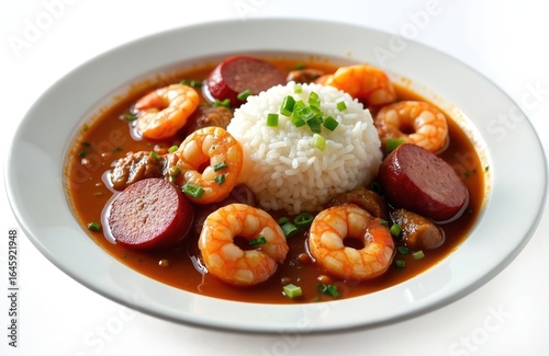 Flavorful seafood gumbo served with rice, sausage on white plate. Aromatic dish features plump shrimp, savory sausage slices, rich broth, garnished with fresh green onions. Perfect for culinary