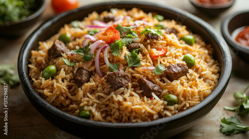 Flavorful spiced rice with tender meat, garnished with fresh herbs, red onions, and vegetables in a black bowl.