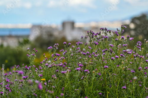 tunis, tunisia, city, season, spring, panorama, nature, park, plant, flower, blosson, heaven, cloud, springlike, landscape, flora, blue, purple, beauty, colours, floral, travel, tour tourism, apartment building, city landscape, mediterranean sea, thistle, purple
