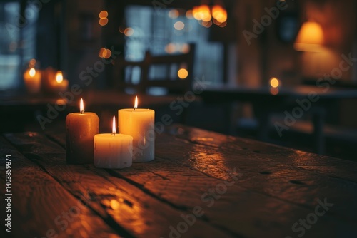 Flickering Candlelight on a Rustic Wooden Table in a Dimly Lit Restaurant, Soft, flickering candlelight illuminating the room, casting a warm glow over the gathering