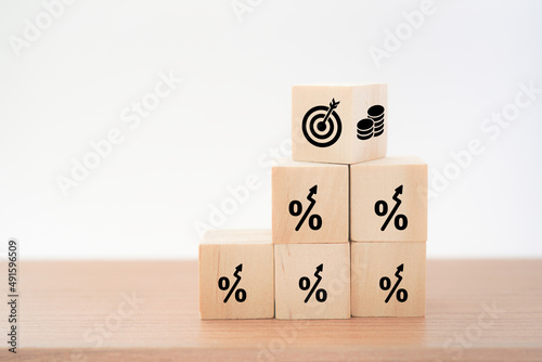 flipped wooden blocks, dartboard and cash icon on top increase percent symbol for business strategy and action plan icon isolated background