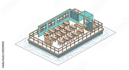 classroom, school, floating, water, platform, building, isometric, desk, whiteboard, education, learning, teaching, student, architecture, structure, modern, minimal, flat, outline, interior, room, space, concept, design, web, mobile, app, branding, print, presentation, project, study, cognition, training, academic, environment, construction