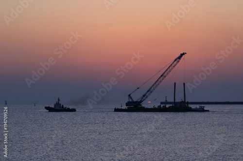 port, crane, sail, sea, industry, waterfront, freight, quay, industrial, water, shipping, boat, sky, transport, container, transportation, construction, sunset, vessel, loading, export, port, nautical, morning, sunrise, civil engineering, landscape