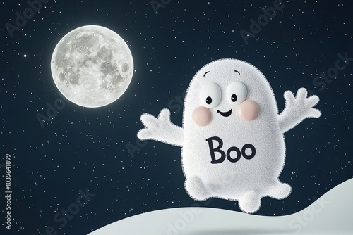 Floating ghost saying "Boo" in playful font, eerie full moon backdrop