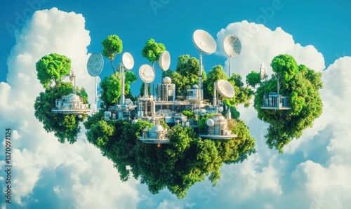 Floating island city with satellite dishes in cloudy sky, ideal for fantasy projects