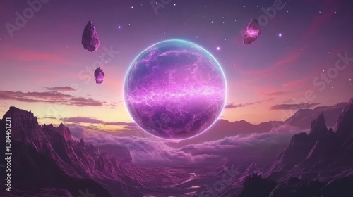 surreal, orb, floating, planet, landscape, alien, mountain, vale, cosmos, space, nebula, futuristic, cosmic, rock, stone, purple, pink, sunset, sunrise, cloud, sky, star, galaxy, aethereal, vibrant, digital, art, fantasy, imagination, design, aesthetic, scenery, horizon, light, energy, glow, colours, nature, digital artwork, illustration, graphic, beautiful, amazing, dreamlike