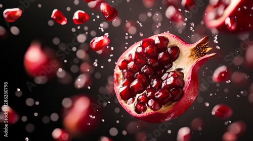 Floating pomegranate seeds in mid-air, high-speed macro photography, visually striking composition
