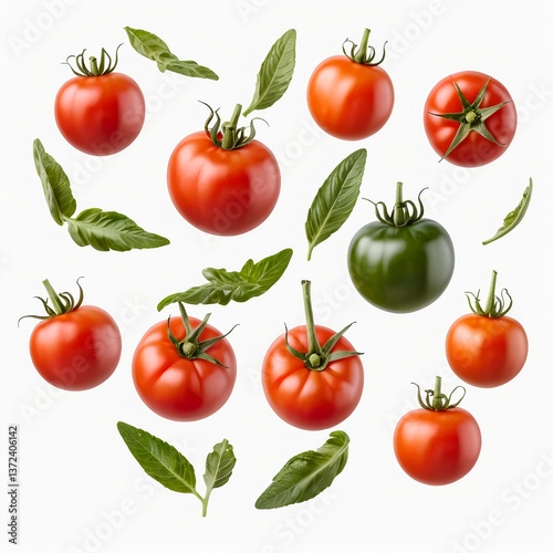 tomatoes, tomatoes, red tomato, green tomato, basil, leaf, leaf, vegetable, vegetable, fresh, ingredient, food, cooking, receipe, healthy, diet, nourishment, organic, farm, garden, isolated, white background, floating, flying, closeup, macro, vibrant, colourful
