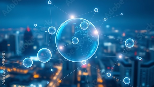Floating translucent spheres connected by glowing lines, symbolizing global business networks.