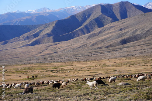 sheep, flock, grazing, mountain, vale, plain, landscape, nature, outdoors, pasture, farm animal, herd, meadow, grass, animal, rural, countryside, hill, shadow, sky, snow, peak, scenery, wildlife, agriculture, open, field, tranquil, remote, environment, natural, terrain, rocky, pastoral, peaceful