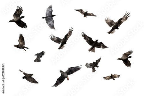 Flock of birds in flight on transparent background for easy decorating projects, PNG style with white background