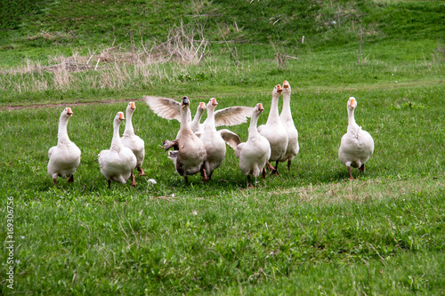 animal, farm, grass, beak, domestic, white, green, nature, feather, flock, bird, agriculture, poultry, goose, wing, lawn, farming, fowl, gaggle, fauna, rural, farm animal, group, village, countryside, scene, field, neck, country, background, young, gander, meadow, farmland, goose, pasture, egg, household, drake, female, water bird, water bird, grazing, herb, herd, spring