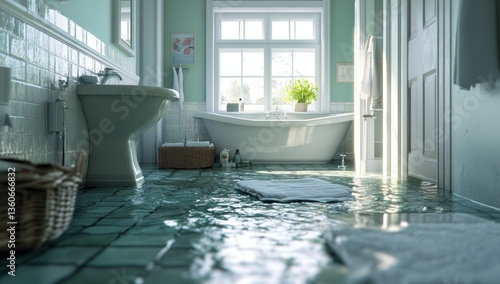 water, flood, bathroom, damage, leak, home, house, repair, plumbing, problem, crisis, emergency, disaster, privies, bathtub, sink, floor, tile, room, interior, wet, clean, renovation, maintenance, wetness, dripping, overflowing, pipe, sponge, bucket, mop, towel, drain, fix, waterproofing, solution, repairing, property, insurance, destruction, inundation, soaked, moisture, humidity, urgent, cleanup, recovery