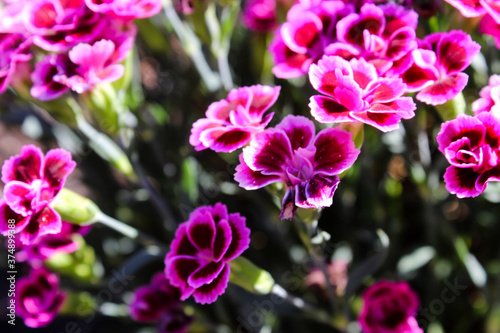 Floral background made of blooming pink garden carnation. Macro view of purple blossom bush.Small beautiful flowers. Springtime and summer concept. Gardening, floristry. Space for text.
