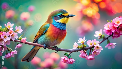 bird, tree branch, flower, fashion, photo, nature, floral, plumage, delicate, vibrant, colourful, spring, summer, aesthetic, detail, closeup, ornithology, wildlife, macro, beauty, elegant, stylish, art, still life, photorealistic, hi-res, digital artwork, creative, modern, contemporary, birding, garden, blossom, foliage, texture, symmetry, composition, photoediting, high-quality, professional, artistic