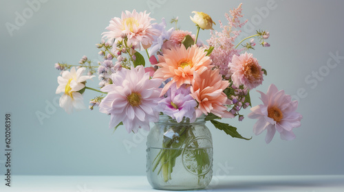 flower, flower, bouquet, botanical, mason, jar, water, stem, leaf, leaf, vase, bunch, blossom, arrangement, floral, flora, bloom, colourful, glasses, blue, pastel, background, wallpaper, copy, space, copy space, bloom, flower petals, generative, ai
