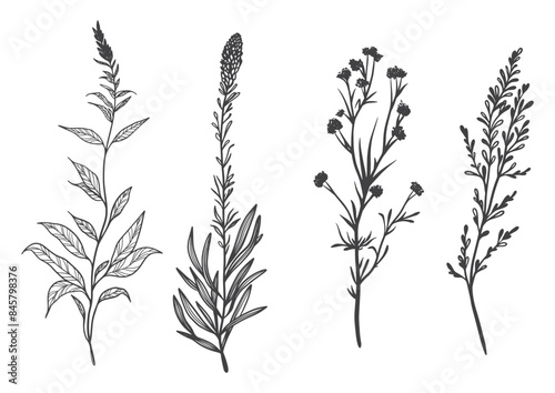 Floral branch and minimalist leaves. Hand drawn line wedding herb, elegant wildflowers. Minimal line art drawing for print, cover or wallpaper