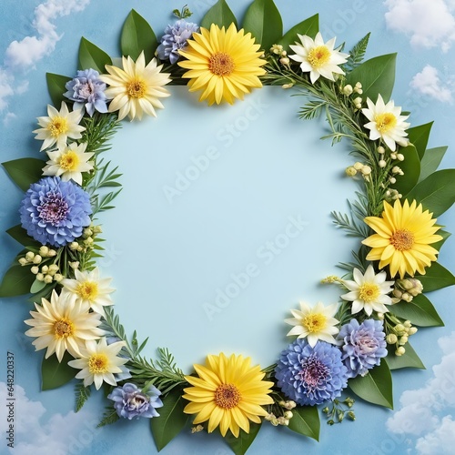 wedding, floral, frame, blue, background, yellow, white, green, leaf, symmetry, decorative, border, artistry, vibrant, calming, contrast, aesthetic, space, design, intricate, crafted, adorned, element, unique, botanical, nature, blossom, bloom, flower petals, foliage, arrangement, pattern