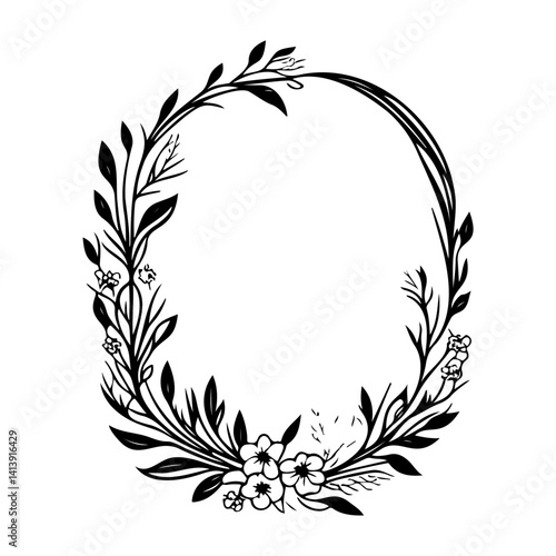 floral, frame, chaplet, botanical, vector, black, white, elegant, decorative, ornament, illustration, design, nature, tree branch, leaf, plant, flower, blossom, flourish, artwork, drawing, vignetting, outline, border, invitation, card, graphic, template, isolated, element, background, springtime, romantic, artistic, minimalist, organic, classic, vintage, simple, stylish, hand-drawn, wedding
