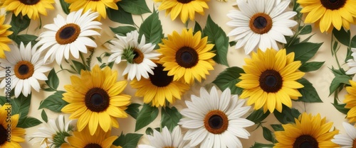 Floral geometric pattern featuring large daisies, sunflowers and leaves on a yellow and white background, floral, pattern, flowers