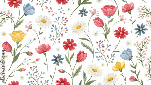 seamless pattern, floral pattern, wildflower, flower, botanical, spring, summer, design, textile, fabric, wallpaper, background, repeat, illustration, colourful, vibrant, cheerful, whimsical, daisy, tulip, poppy, blossom, bloom, nature, pretty, pastel, delicate, feminine, romantic, artwork, art, graphic, texture, digital, print